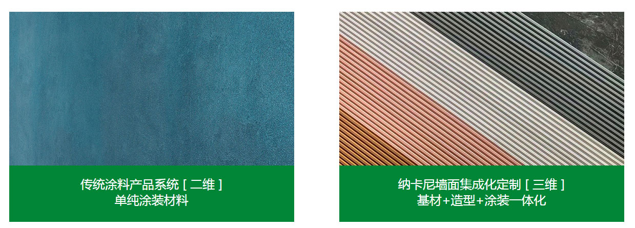 在传统涂装之上,提供基材、造型搭建、配套辅件等,一站式服务支持,打破饰面与基材的分项供应,打造更具美感的墙面艺术造型,形成纳卡尼特有的产品服务供应